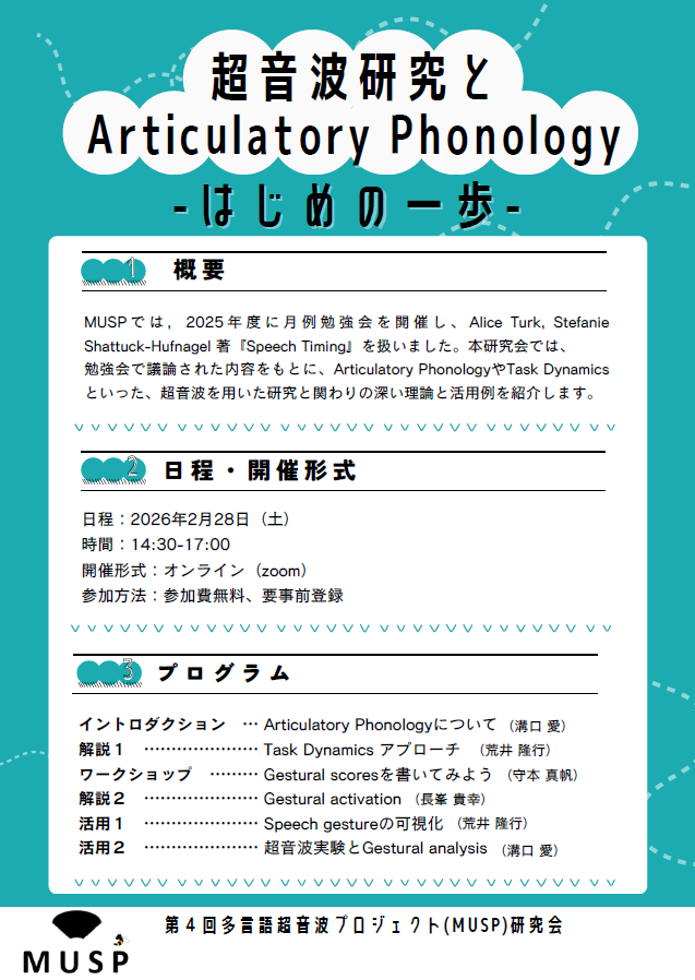 MUSPでは、2025年度に月例勉強会を開催し、Alice Turk, Stefanie Shattuck-Hufnagel 著『Speech Timing』を扱いました。本研究会では、勉強会で議論された内容をもとに、Articulatory PhonologyやTask Dynamics といった、超音波を用いた研究と関わりの深い理論と活用例を紹介します。